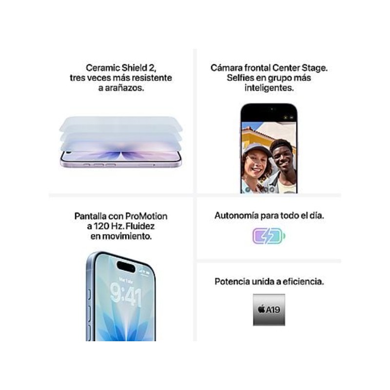 Hay motivos de sobra para que te encanten los nuevos modelos de iPhone. Las herramientas de Apple Intelligence te ayudan en tu día a día. El nuevo chip N1 de Apple mejora el rendimiento y la fiabilidad gracias a las conexiones inalámbricas Wi‑Fi 7, Bluetooth 6 y Thread. La compatibilidad con redes 5G y la eSIM aportan velocidad y protección. Y las prestaciones de seguridad están diseñadas para cubrirte las espaldas.