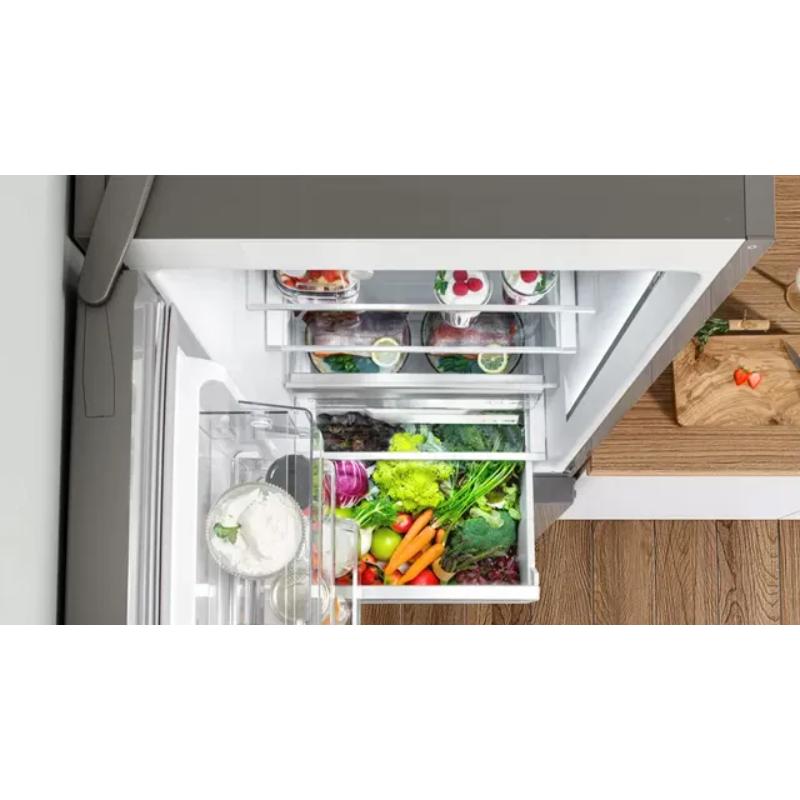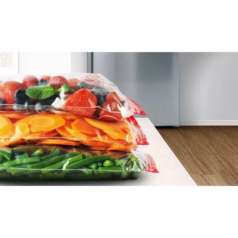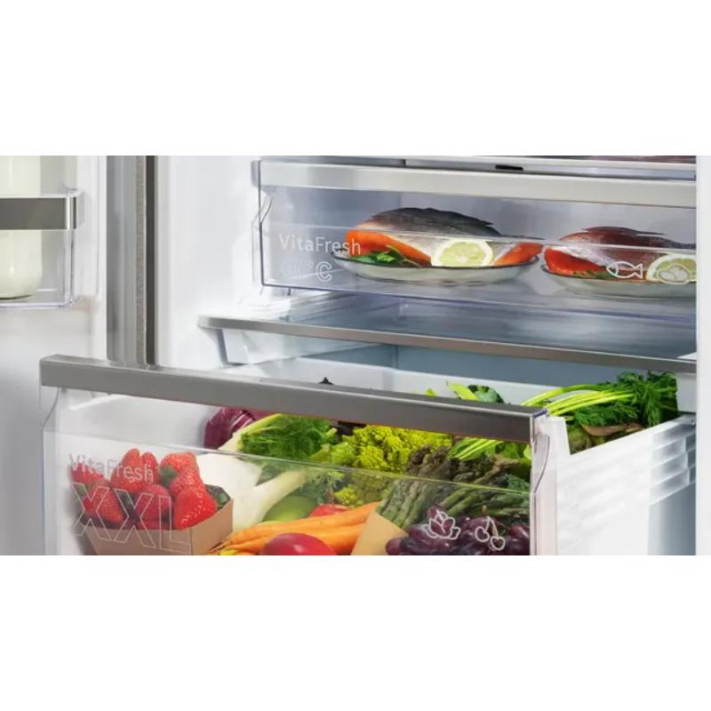 El sistema VitaFresh XXL 0 °C no solo es espacioso, también ofrece un entorno de almacenamiento ideal para los alimentos frescos. Mantiene una temperatura más baja para las carnes y pescados, y un cajón con mayor nivel de humedad que conserva las frutas y verduras perfectamente frescas.