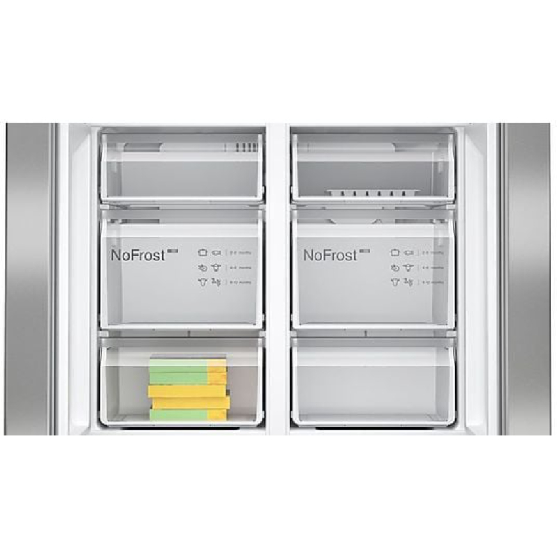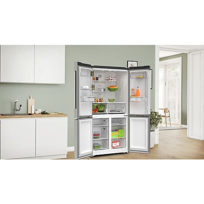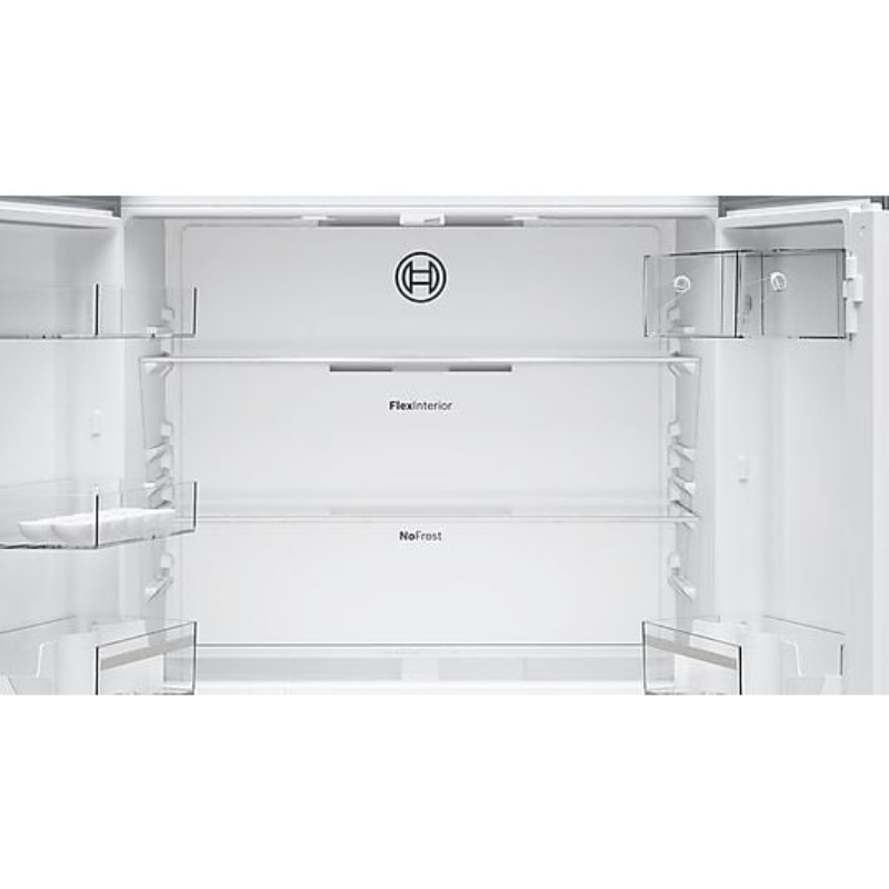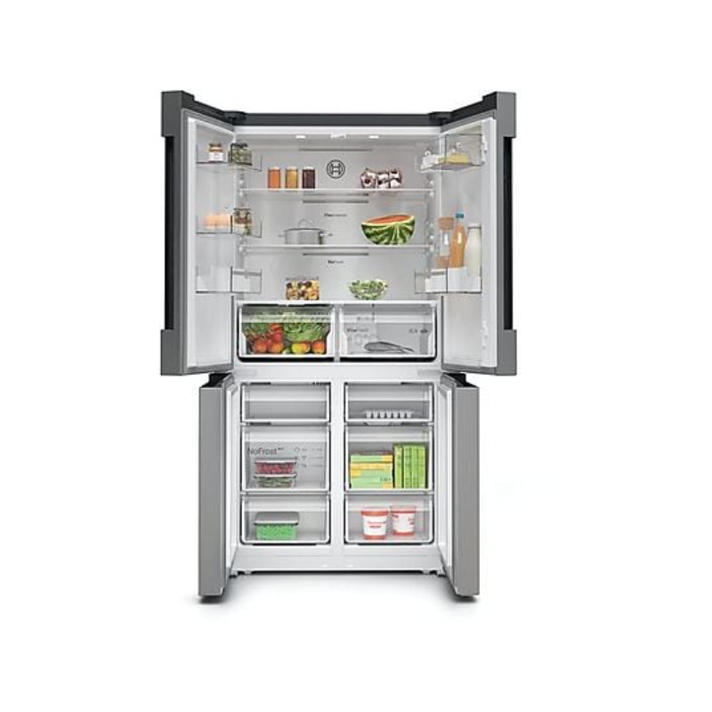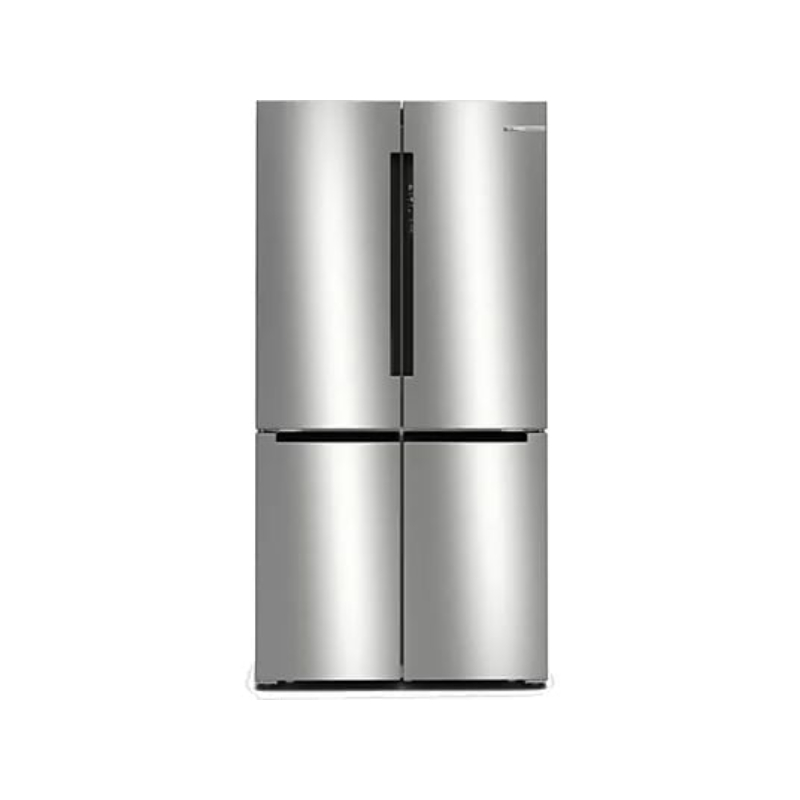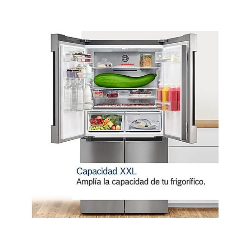 Frigorífico americano Bosch de gran capacidad con diseño French Door y ancho especial de 90 cm. Incorpora sistema MultiAir Flow, cajón VitaFresh XXL 0 °C y tecnología No Frost para una conservación óptima y sin mantenimiento.