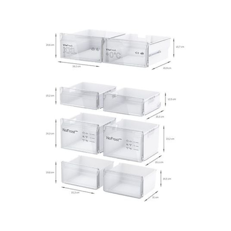Gracias a la tecnología No Frost, se evita la formación de escarcha tanto en el frigorífico como en el congelador, eliminando la necesidad de descongelación manual. El congelador inferior cuenta con 6 cajones, incluyendo el práctico BigBox, perfecto para alimentos de gran tamaño.