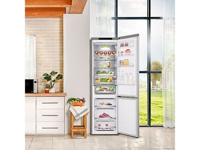 Un frigorífico combi de gran capacidad que mantiene los alimentos frescos durante más tiempo y reduce el consumo energético. Gracias a la tecnología DoorCooling+™, el frío se distribuye de forma rápida y uniforme, mientras que el sistema No Frost evita la formación de escarcha. Su diseño en inox antihuellas combina elegancia y fácil mantenimiento.