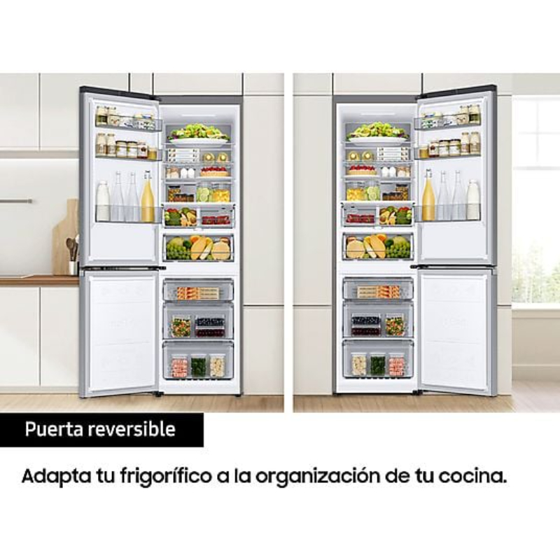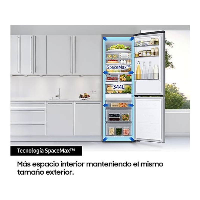 El frigorífico combi Samsung Smart RB34C775CS9/EF ha sido diseñado para quienes buscan un rendimiento avanzado, eficiencia y conectividad en un formato elegante y funcional. Con una altura de 185.3 cm y una capacidad total de 344 litros, se adapta perfectamente a hogares que valoran la tecnología y el cuidado de los alimentos.