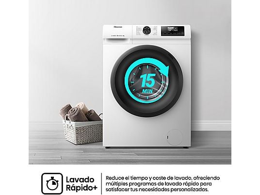 La Hisense WF1Q8041BW es una lavadora de carga frontal independiente, diseñada para familias que buscan eficiencia y cuidado de la ropa en un solo equipo. Su capacidad de 8 kg y 15 programas de lavado cubren todas las necesidades: desde ropa delicada y deportiva hasta prendas para bebés y edredones.