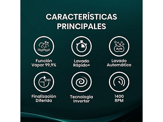 Velocidad máxima de centrifugado: 1400 rpm — Extrae agua de manera eficiente para reducir tiempo de secado.