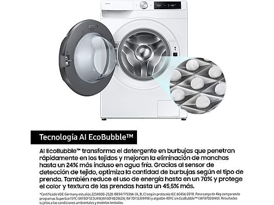Gracias a la tecnología AI EcoBubble™, el detergente se transforma en burbujas que penetran rápidamente en los tejidos, logrando una limpieza profunda incluso a bajas temperaturas. La función AI Wash analiza la carga y ajusta automáticamente el ciclo para optimizar recursos, mientras que la autodosificación AutoDos añade la cantidad exacta de detergente y suavizante en cada lavado.