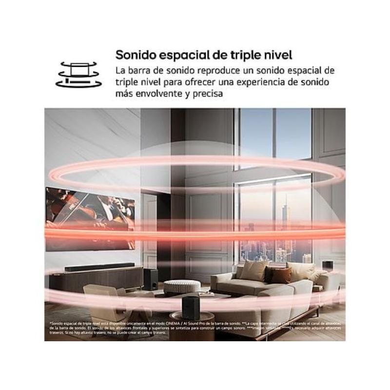 La barra de sonido reproduce un sonido espacial de triple nivel para ofrecer una experiencia de sonido más envolvente y precisa.