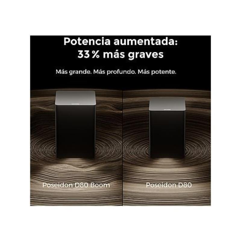 El Ultimea Poseidon D80 Boom, una barra de sonido inteligente de alta calidad actualizada del aclamado modelo Poseidon D80, Con un desplazamiento de membrana de hasta 16 mm, el subwoofer libera graves profundos y potentes con claridad y control, ofreciendo ahora un 33 % más de graves que el Poseidon D80. Con 8 altavoces de alto rendimiento, incluido un potente subwoofer inalámbrico de 6,5 pulgadas, el Poseidon D80 Boom crea una experiencia envolvente 3D. (Nota: el D80 Boom no admite decodificación DTS.)