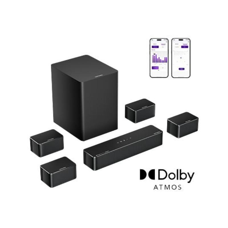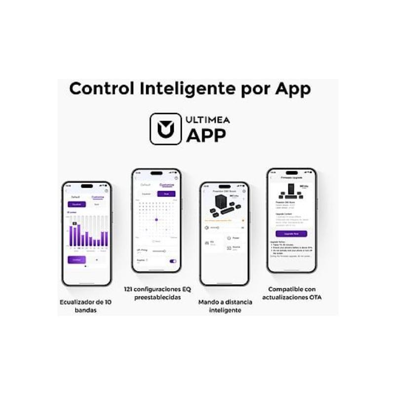 4 altavoces envolventes ajustables, tecnología SurroundX patentada de Ultimea, Bass ajustables y tecnología BassMX, Diseño plano, Sistema de sonido envolvente de 7.1 canales con Dolby Atmos, Ultimea Control de aplicación inteligente, ajustes de ecualizador de 10 bandas, 121 matrices de ecualizador preestablecidas |