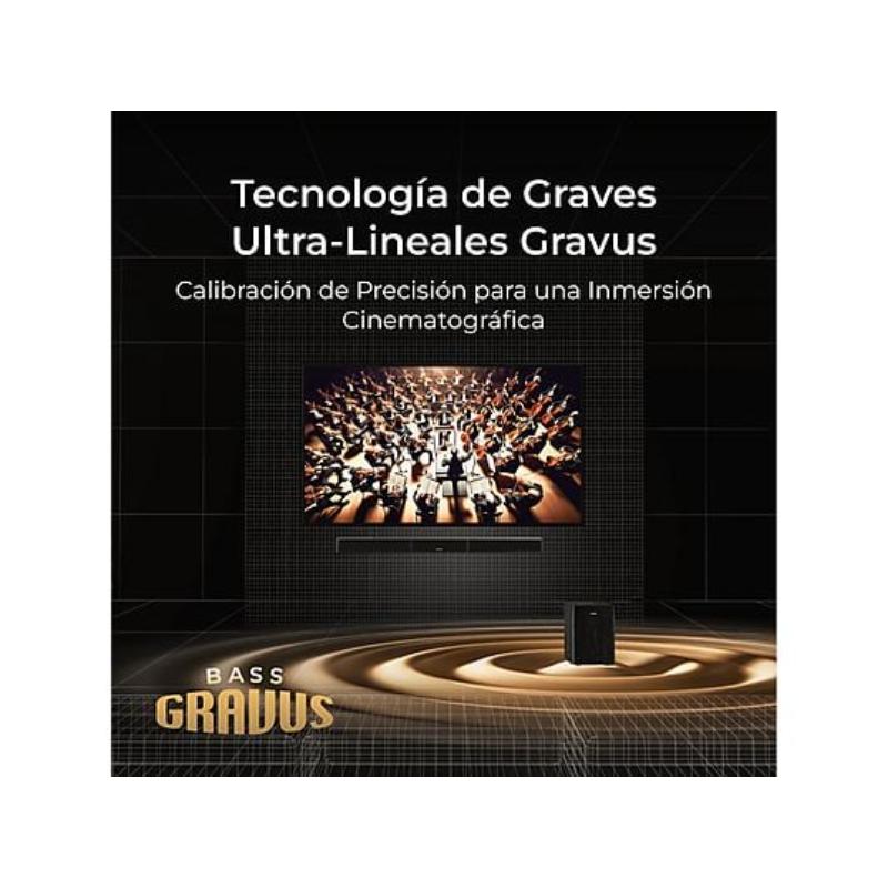 Nota: DTS no es compatible. - Gravus Ultra-Bass: El subwoofer de 6,5″ ofrece graves profundos de hasta 20 Hz y 530 W de potencia máxima – potentes, precisos y sin distorsión.